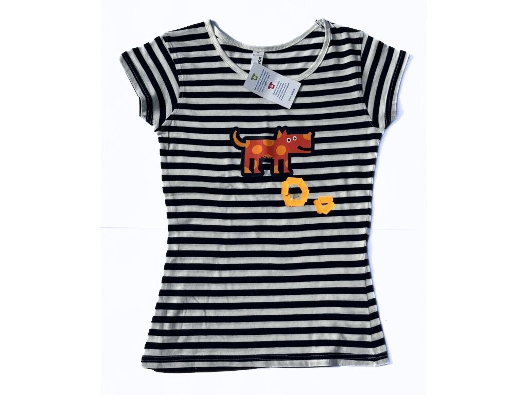 Dámské pruhované tričko s motivem PES velikosti XS. Na přední straně má skvrny viz fotografie.